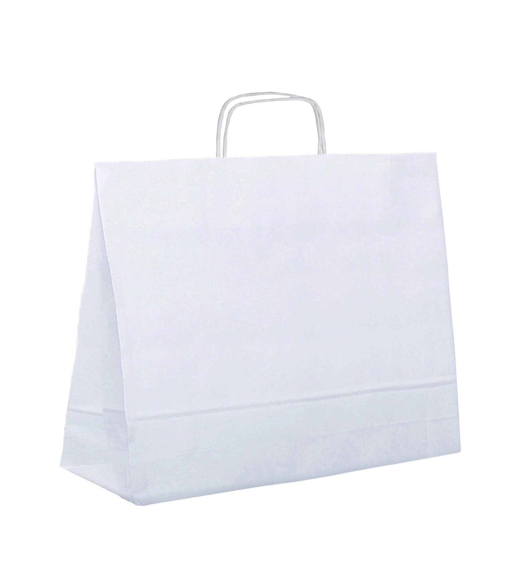 Papiertüte mit stabilen Griffen aus einer Papierkordel oder mit flachem Griff. Diese flotte weiße Tragetasche aus starkem Kraftpapier ist ideal für die Mitgabe verschiedener Artikel. Sowohl im Lebensmittel- als auch im Non-Food-Bereich. Denken Sie dabei an: Lebensmittel, Kleidung, Zeitschriften und Geschenke. Die